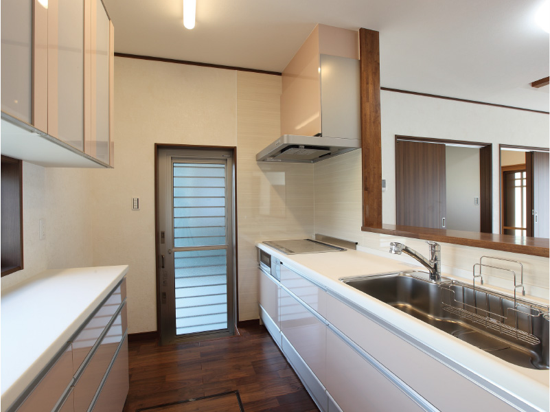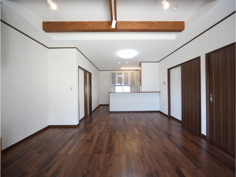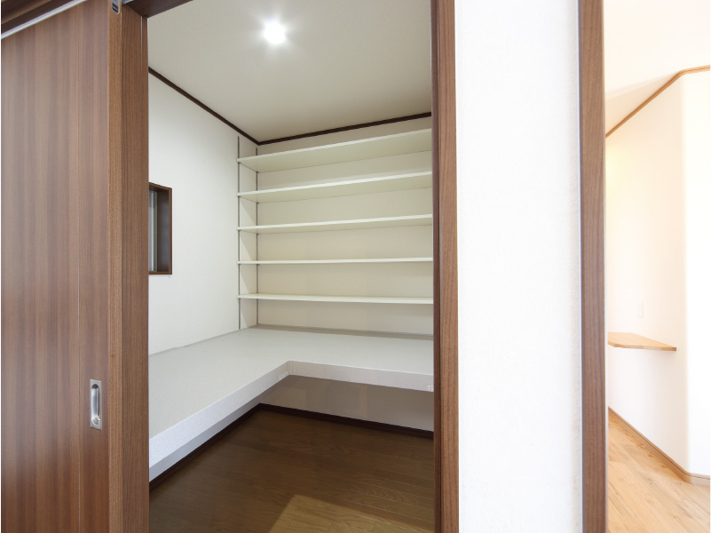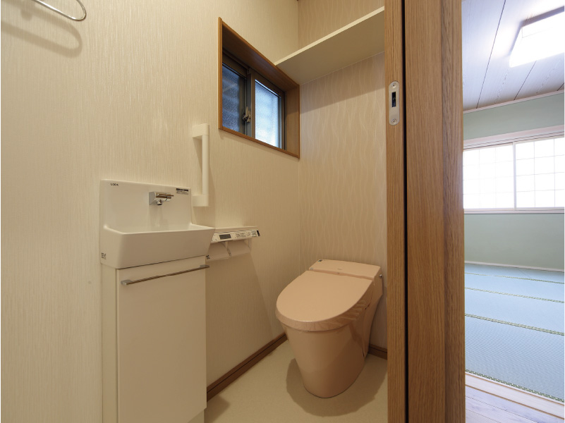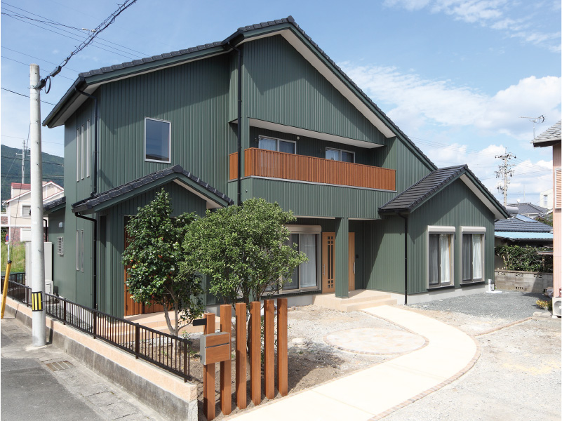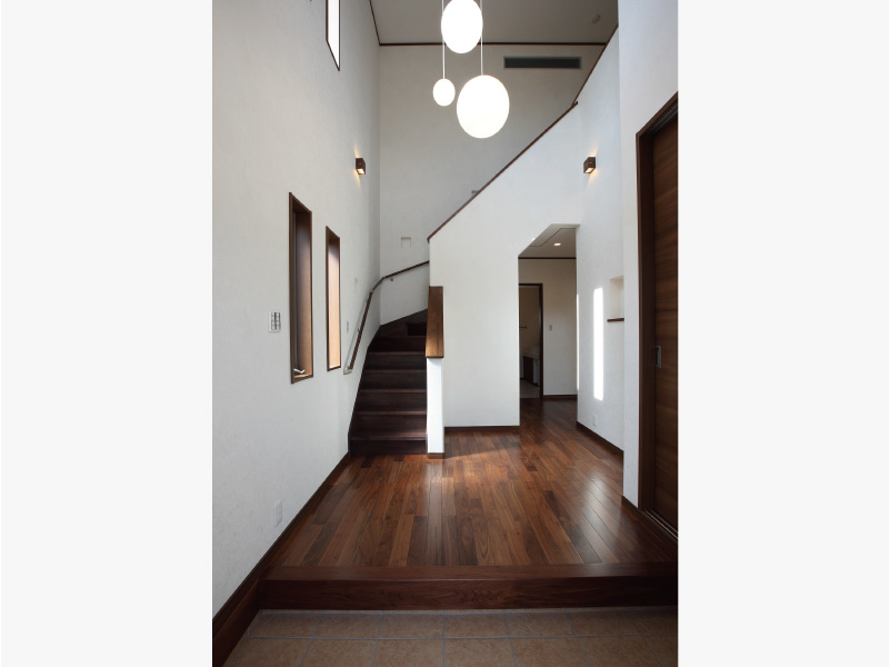 大胆な切妻屋根が目を引く重圧感のある佇まいです。 明るく広々とした玄関には、大空間の吹き抜けをもつ玄関ホールです。 2階の高窓からたっぷりと日差しが差し込み、家族を、訪れる人たちをあたたかく迎えいれます。 和室では、本格的な設えの中にも丸みのある垂れ壁と竹の落とし掛けを使うことでやすらぎの空間をつくりあげました。